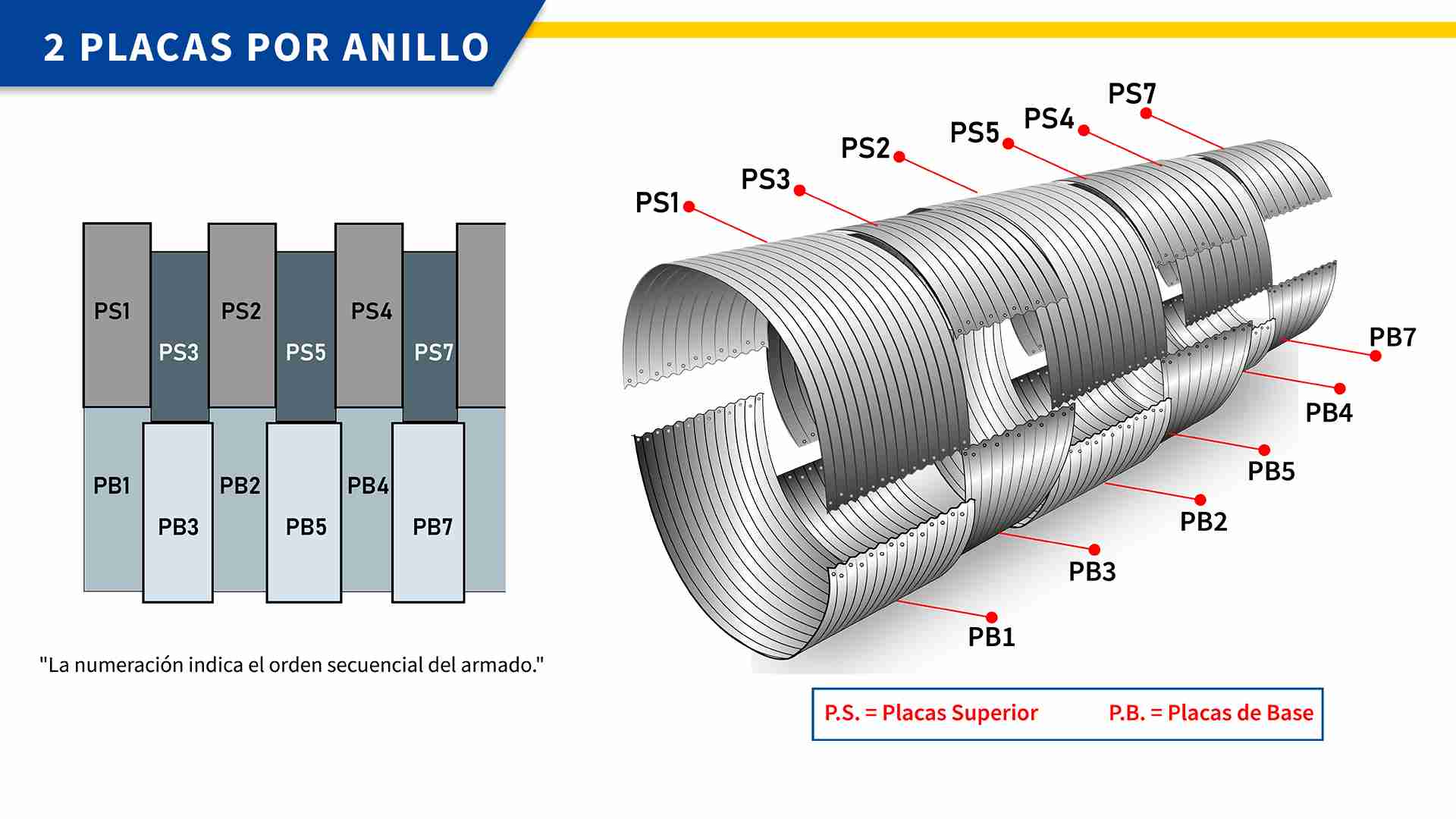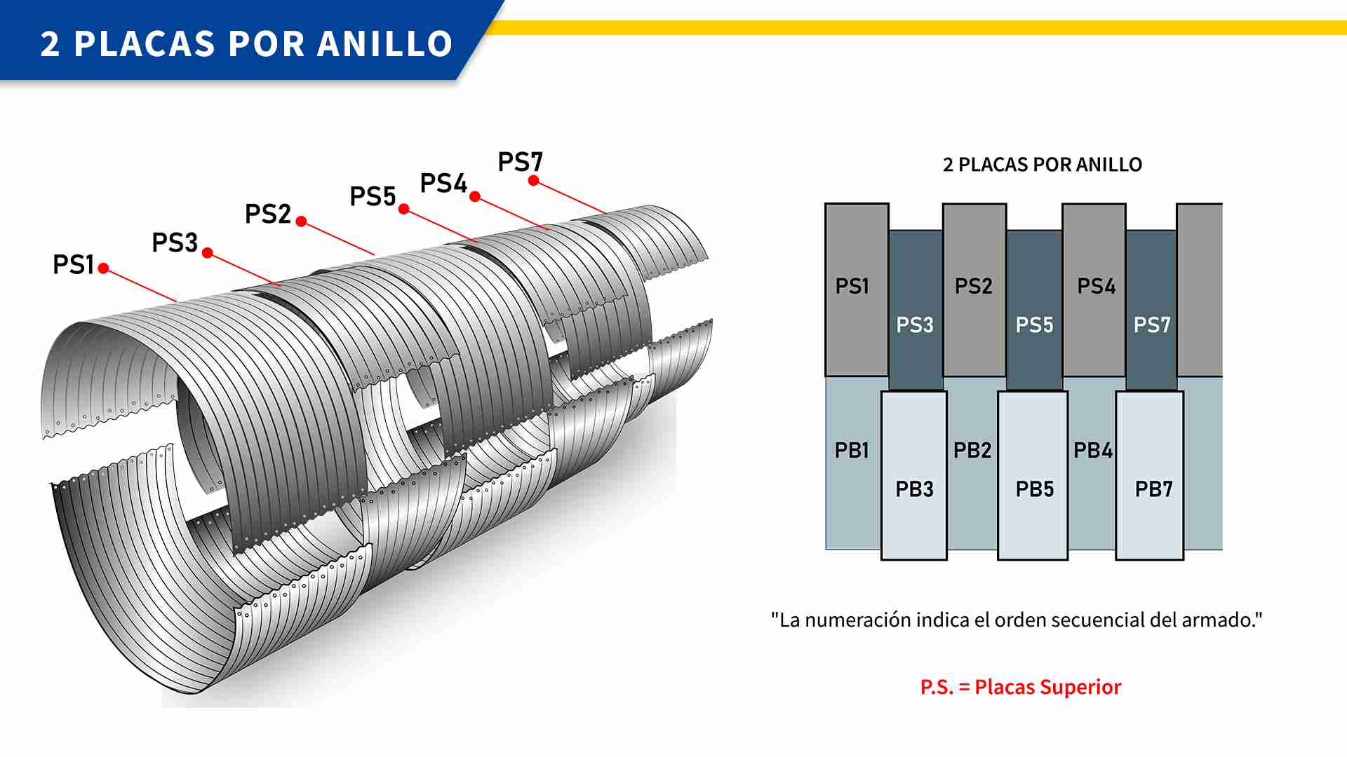 - Una vez colocadas las placas de base, proceda con el montaje de las placas superiores (PS1, PS2, PS3...), de acuerdo a la secuencia que se indica en la Imagen, de tal manera que las perforaciones coincidan, en caso contrario, gire la placa hacia el otro lado y de esta manera TODOS los orificios coincidirán.