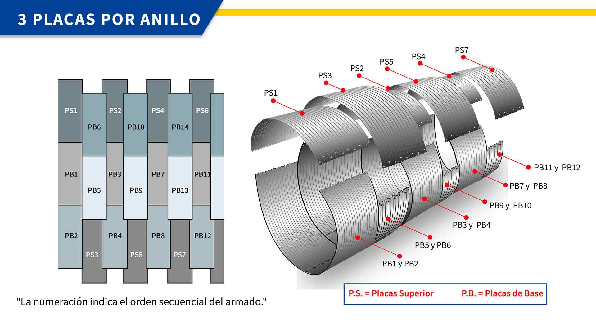 - Una vez colocadas las placas de base, proceda con el montaje de las placas superiores (PS1, PS2, PS3...), de acuerdo a la secuencia que se indica en la Imagen.