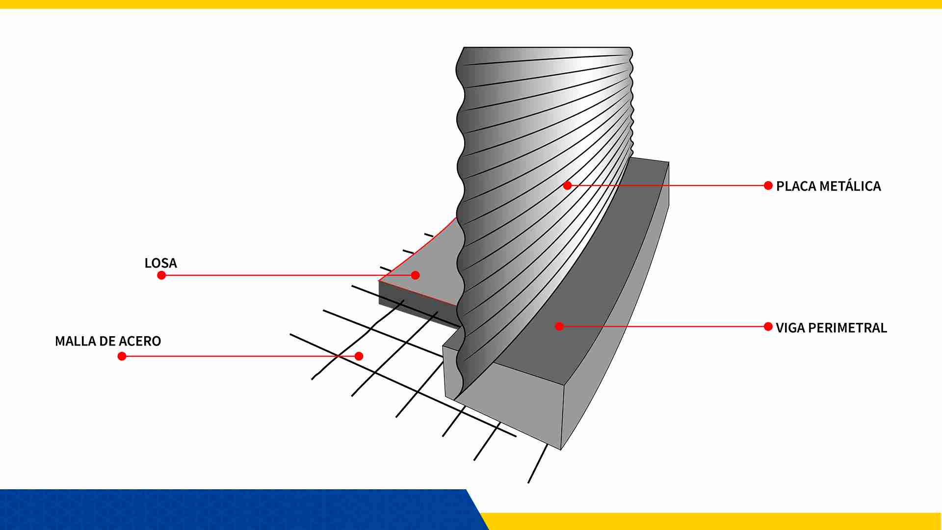 - Viga Perimetral y Losa: La base de soporte está conformada por la Viga Perimetral y la Losa inferior,